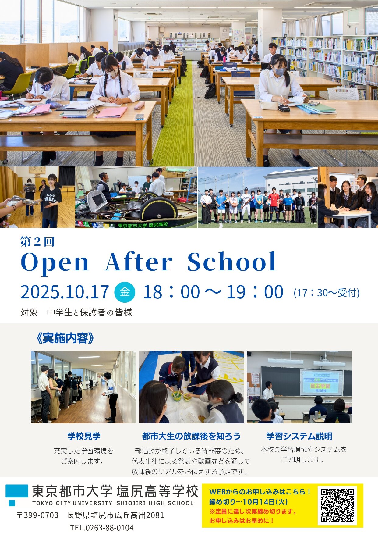 10月17日(金)に予定されている第2回オープンアフタースクールのお申し込み受け付けを開始しました。本校生徒の放課後(アフタースクール)の過ごし方を実際に見ていただくイベントです。多くの皆様のご参加をお待ちしております。