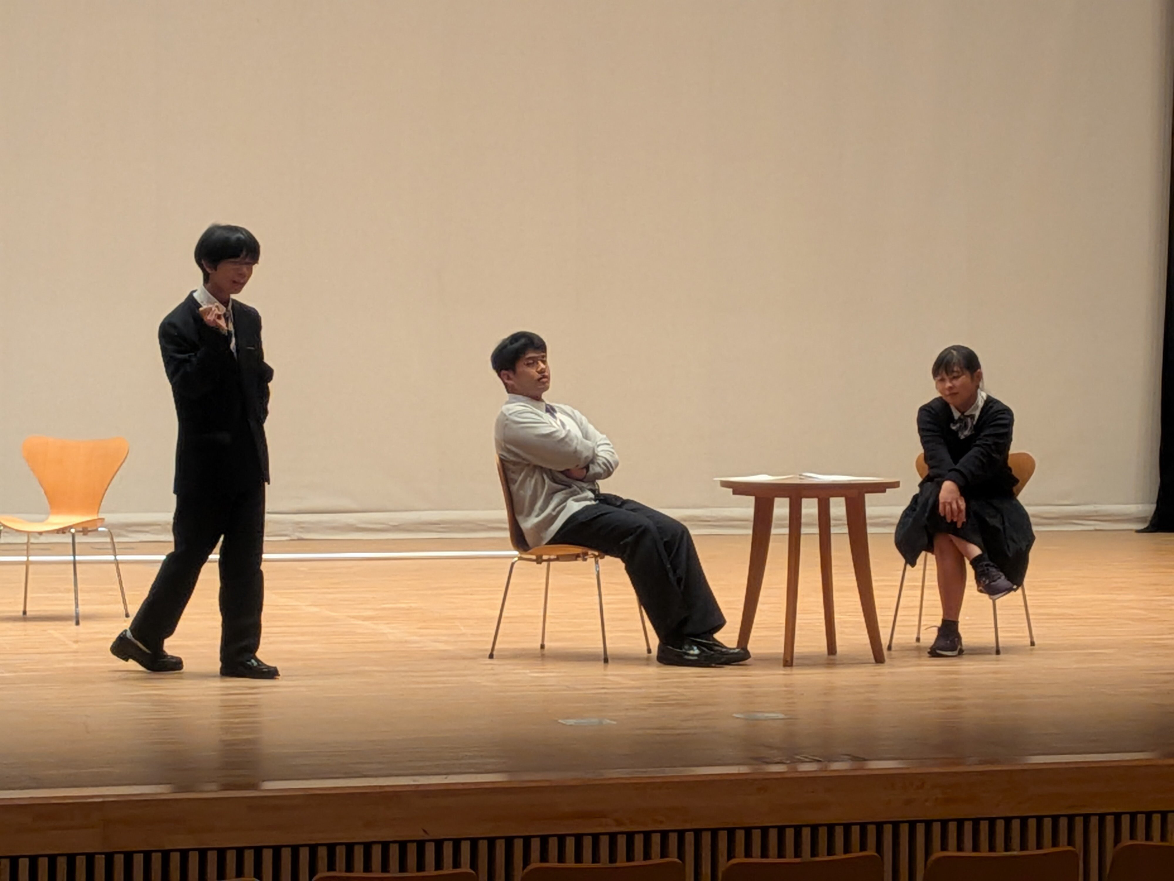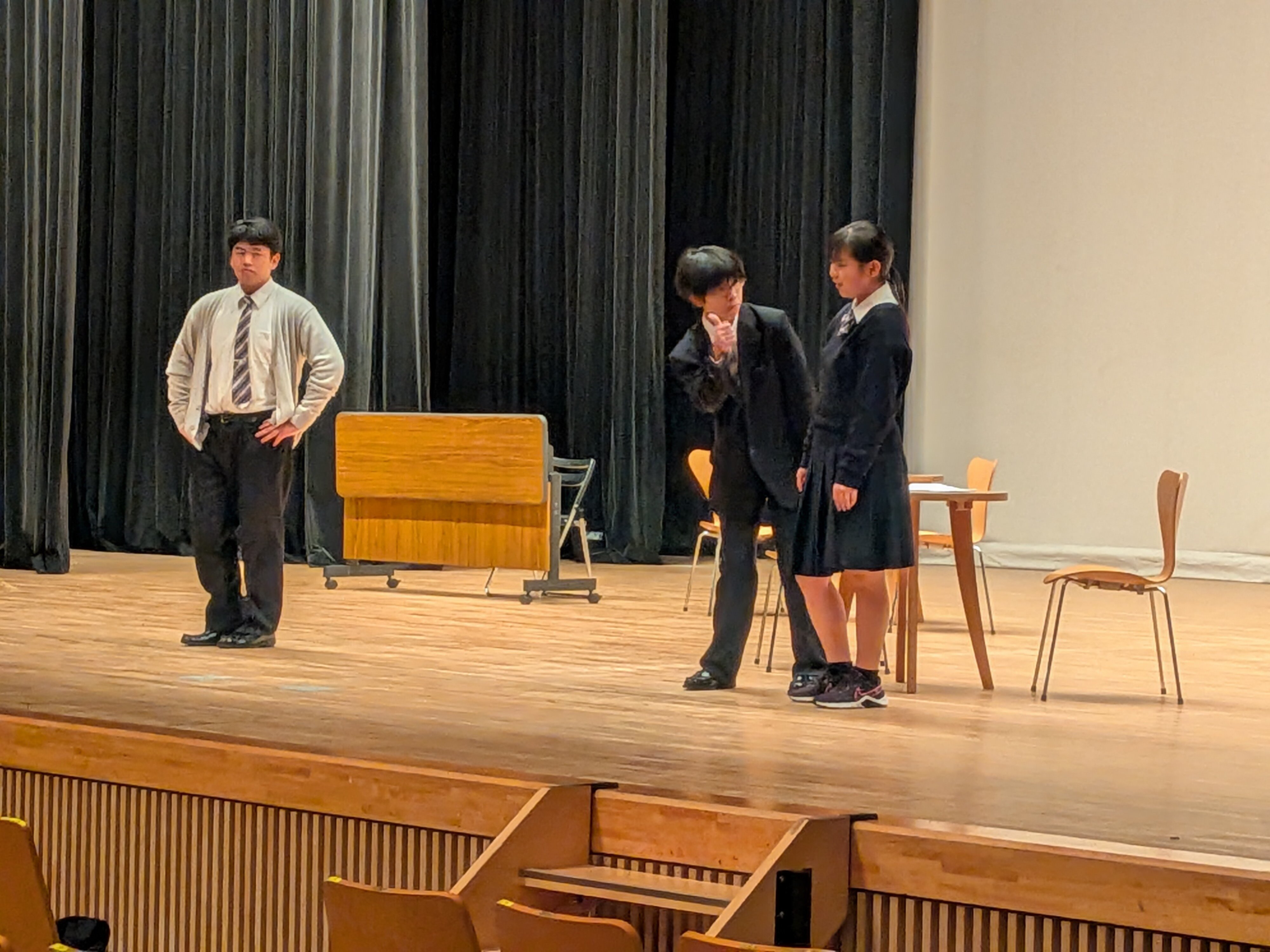 本番で本校演劇部が出演する時間は 13:55〜14:25 の30分間。限られた持ち時間の中で最大限の表現ができるよう、部員たちは立ち位置や導線を入念にチェックし、場面転換のタイミングや演技の入り方など、細かな動作を一つひとつ丁寧に修正していきました。