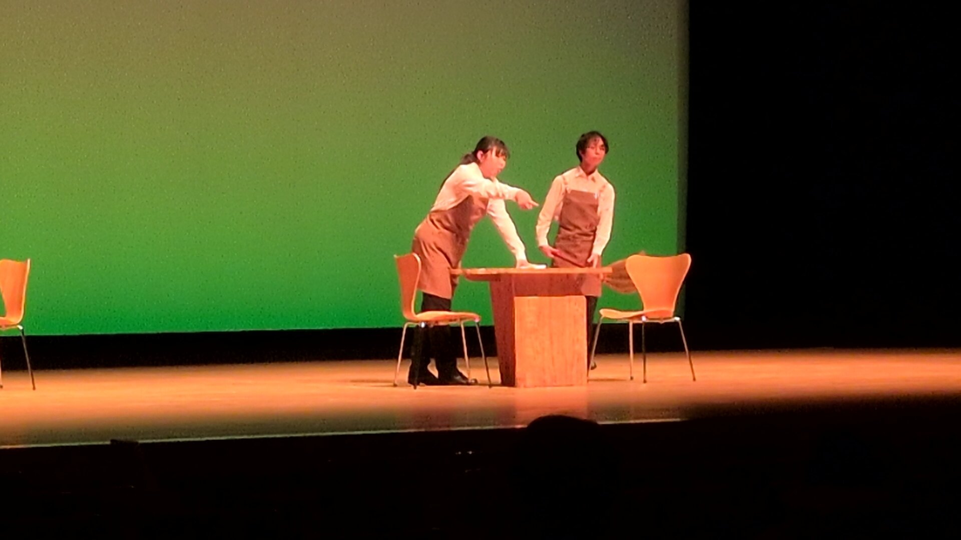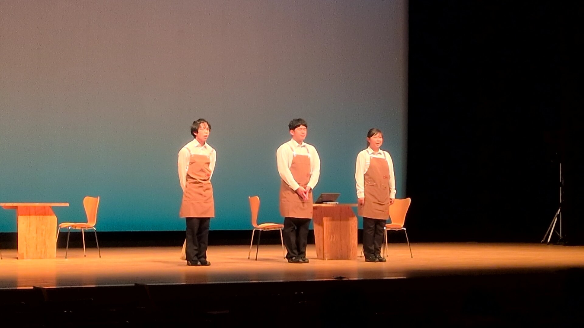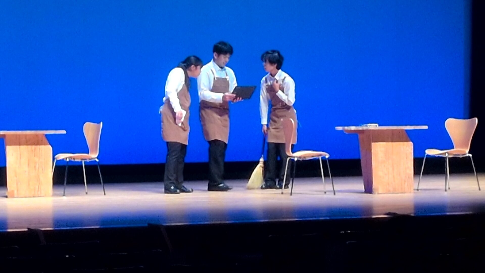 本校演劇部が上演した演目は、「ド田舎にカフェは似合わない」です。本作品は、脚本・演出・舞台構成に至るまで、すべて部員が主体となって創り上げたオリジナル作品です。制作にあたっては、登場人物の設定や物語の展開について何度も話し合いを重ね、観客に伝わる表現とは何かを模索してきました。本番では、限られた上演時間の中でもテンポのよい展開と個性豊かな演技が会場を引き込み、笑いや温かい拍手が送られました。終演後のアンケートでも、「内容が分かりやすく楽しかった」「生徒主体で作ったとは思えない完成度」といった声が多く寄せられ、好評を博しました。