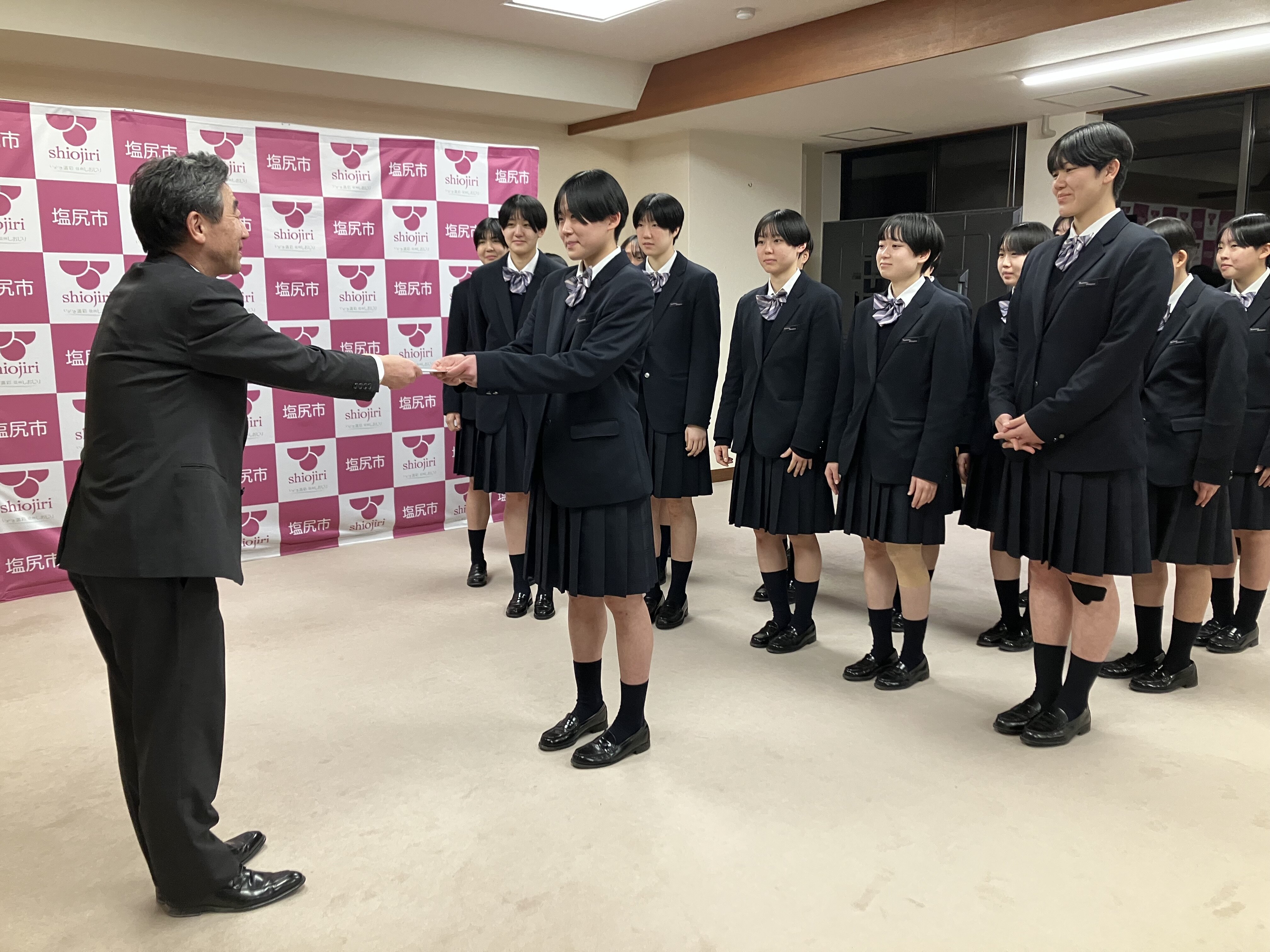 キャプテンから「3年生にとっては最後の集大成の大会となるので、これまで支えてもらった方々への感謝の気持ちを忘れず、その恩に報いるためにも日本一を獲りたい」と強い決意表明がなされると、百瀬市長からは「県大会8連覇ということで、すでに強豪として全国に名の知れたチームですが、それでも勝ち上がるまでには毎回厳しい道のりがあるのだと思います。新聞記事で読みましたが、今回はケガで長期間戦列を離れていた選手をコートに立たせたいという、仲間を思う強い気持ちが勝ちにつながったのだと感じました。そのチームワークに感銘を受けました。春高の舞台では、支えてくれた仲間や先生、家族への感謝の気持ちを持って、長野県代表、塩尻代表として強い気持ちで戦ってほしい。そしてぜひ塩尻の名を全国に広めてほしい」と熱い激励のお言葉をいただきました。