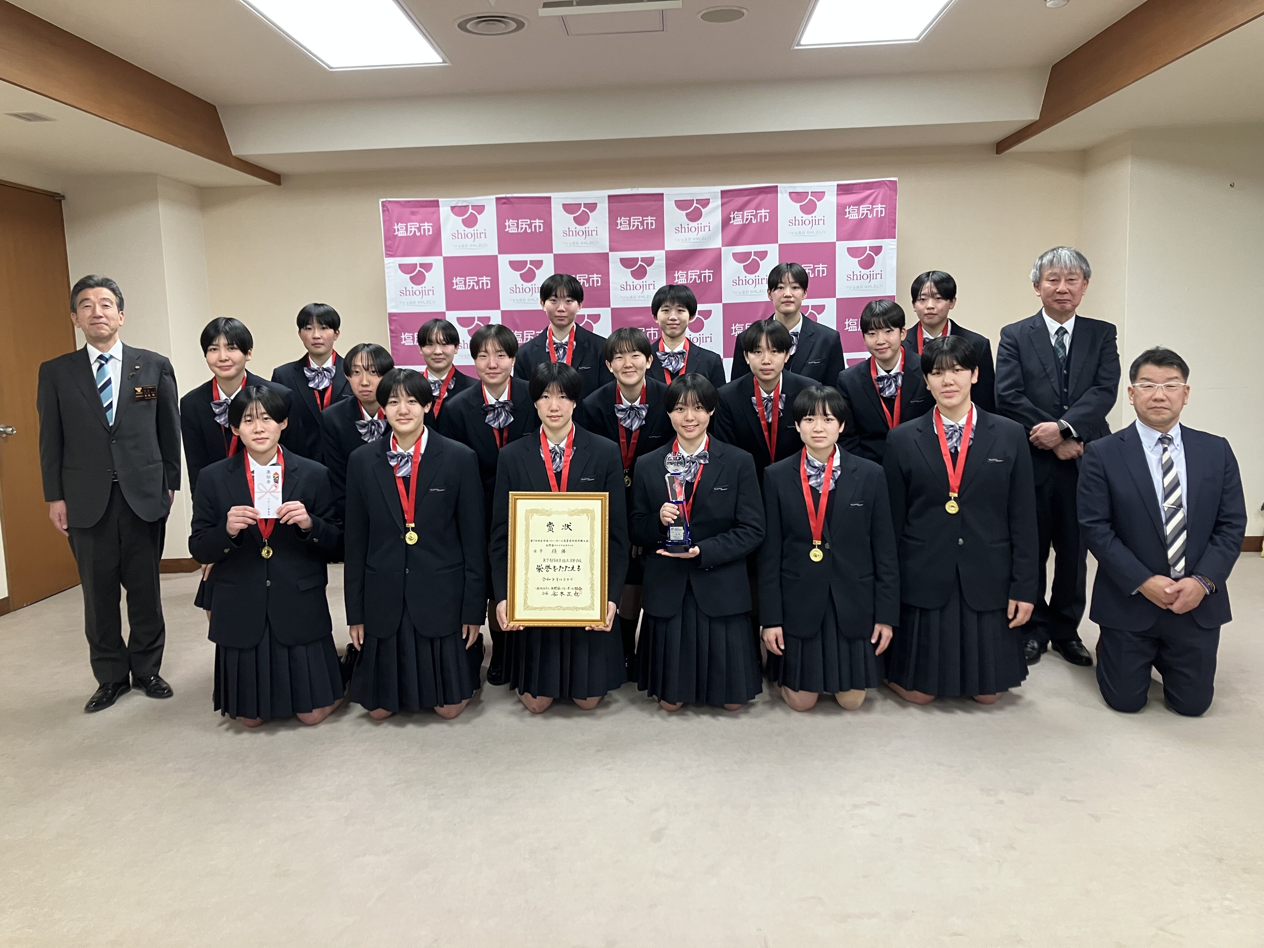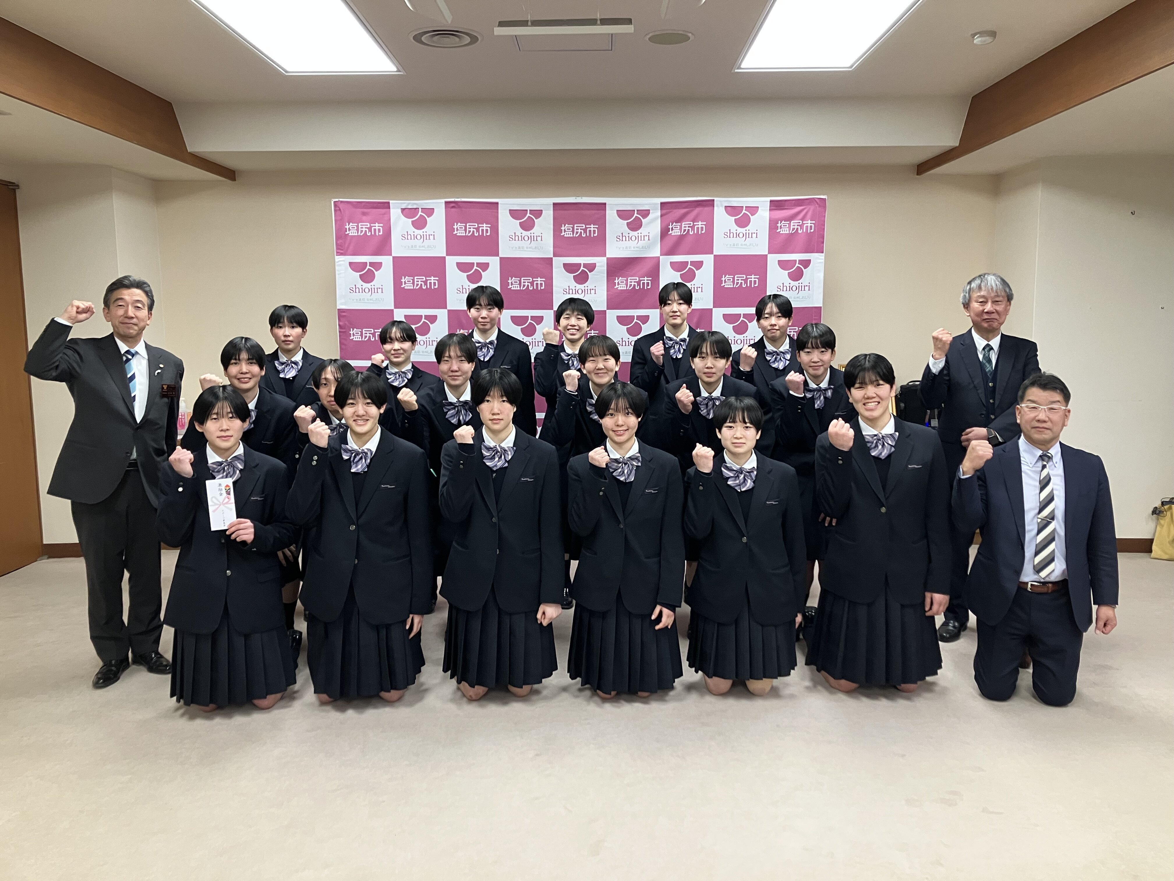 春高バレーに長野県代表として出場する女子バレーボール部の代表生徒18名が、阪本校長、監督らとともに百瀬敬塩尻市長にご挨拶に伺いました。