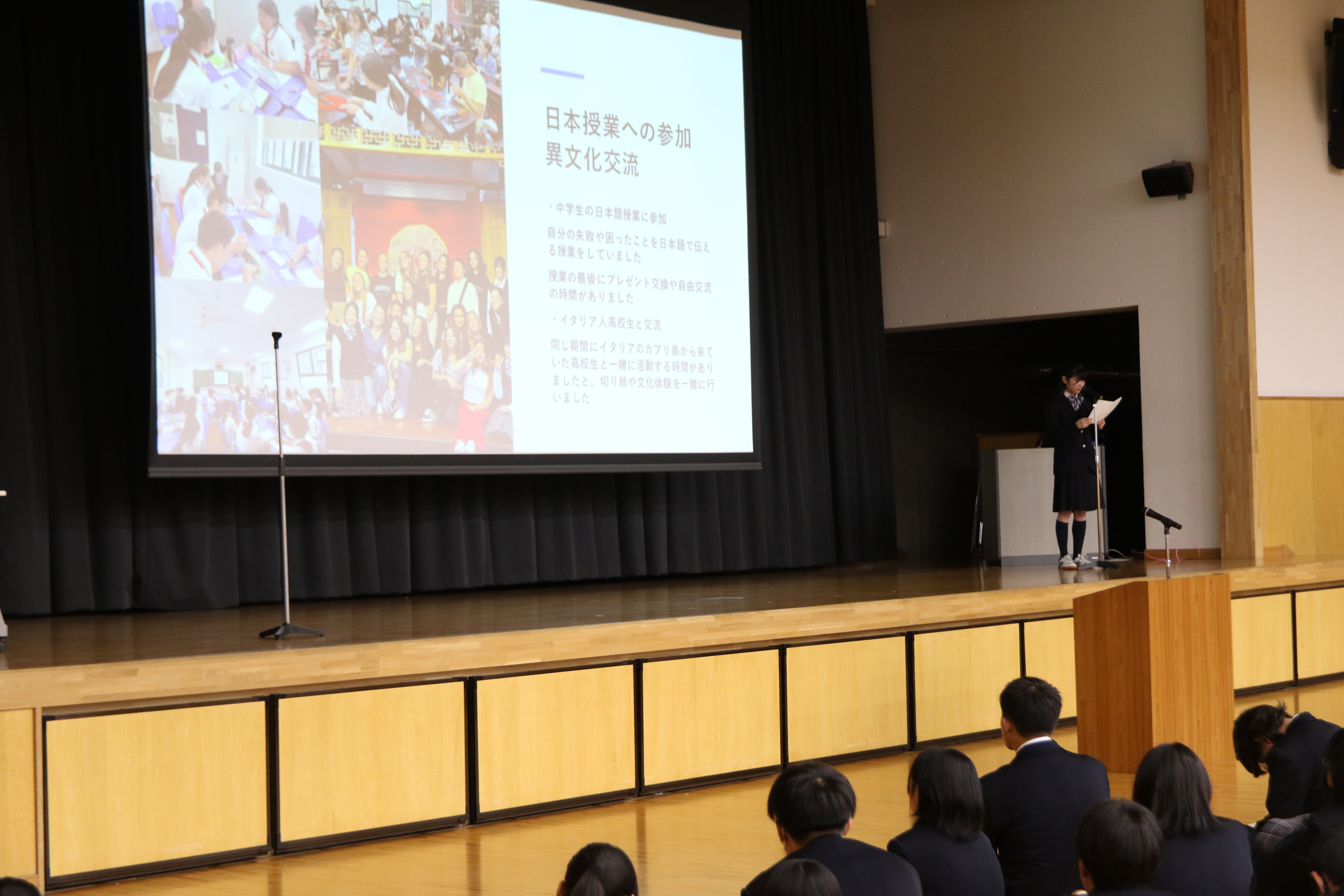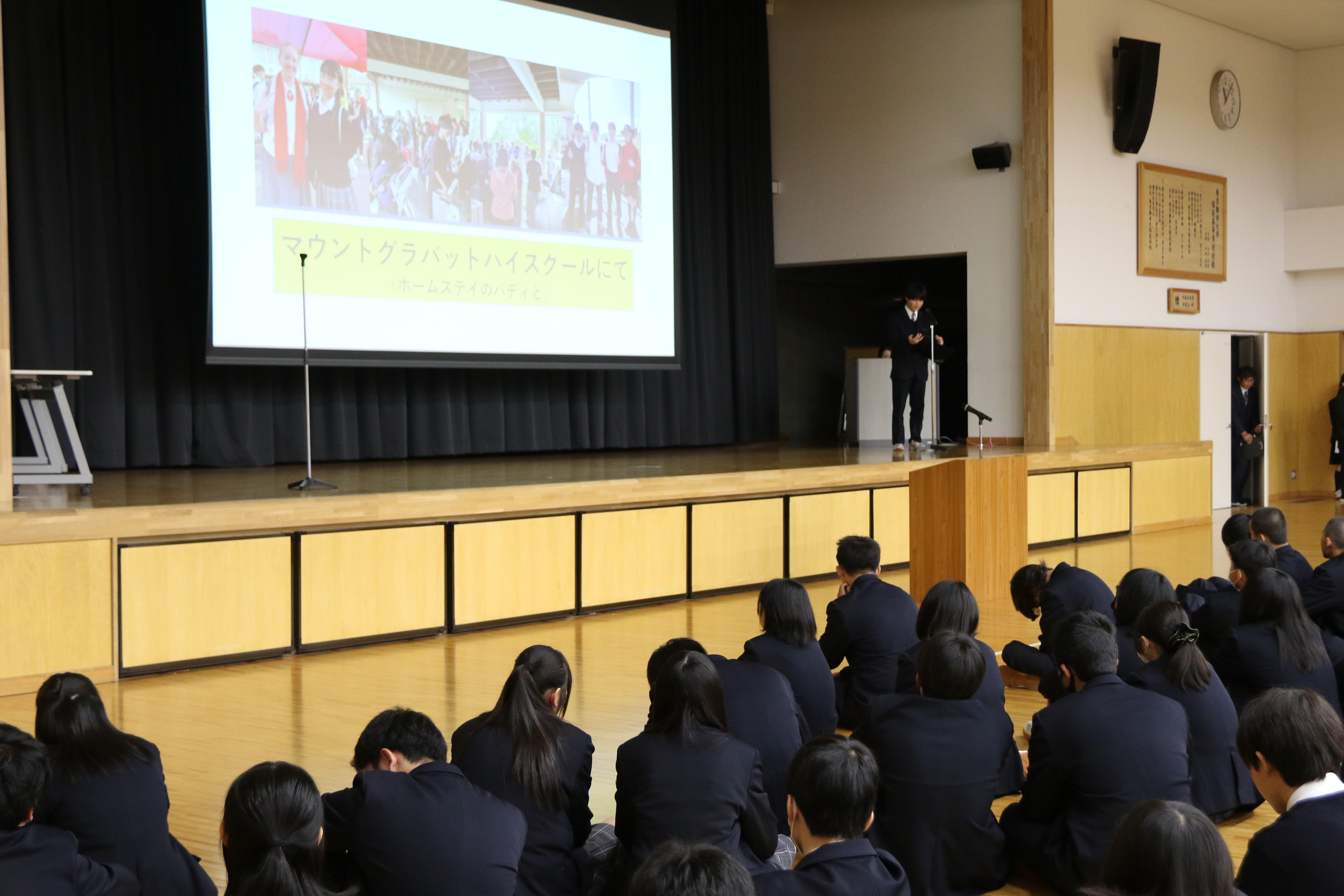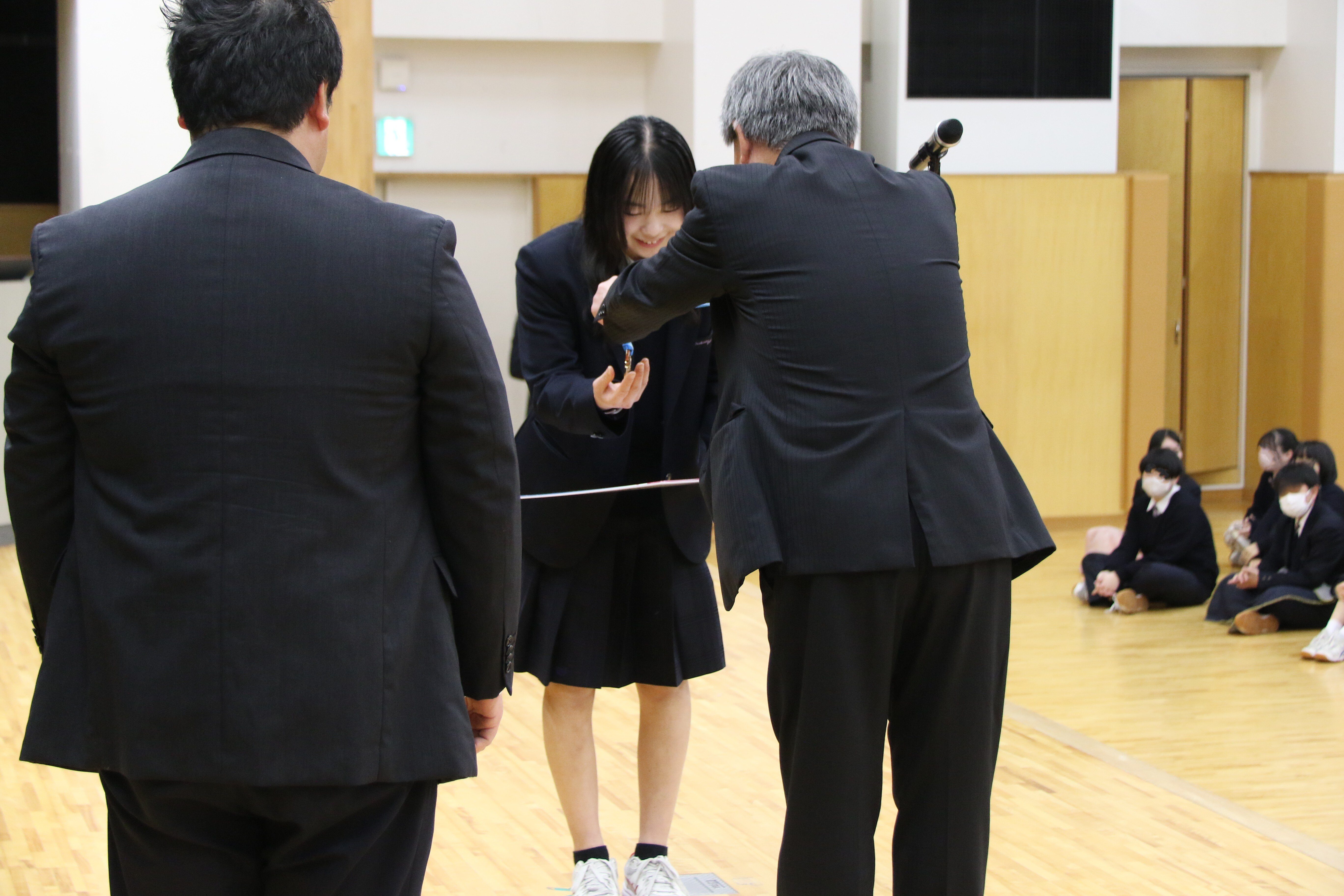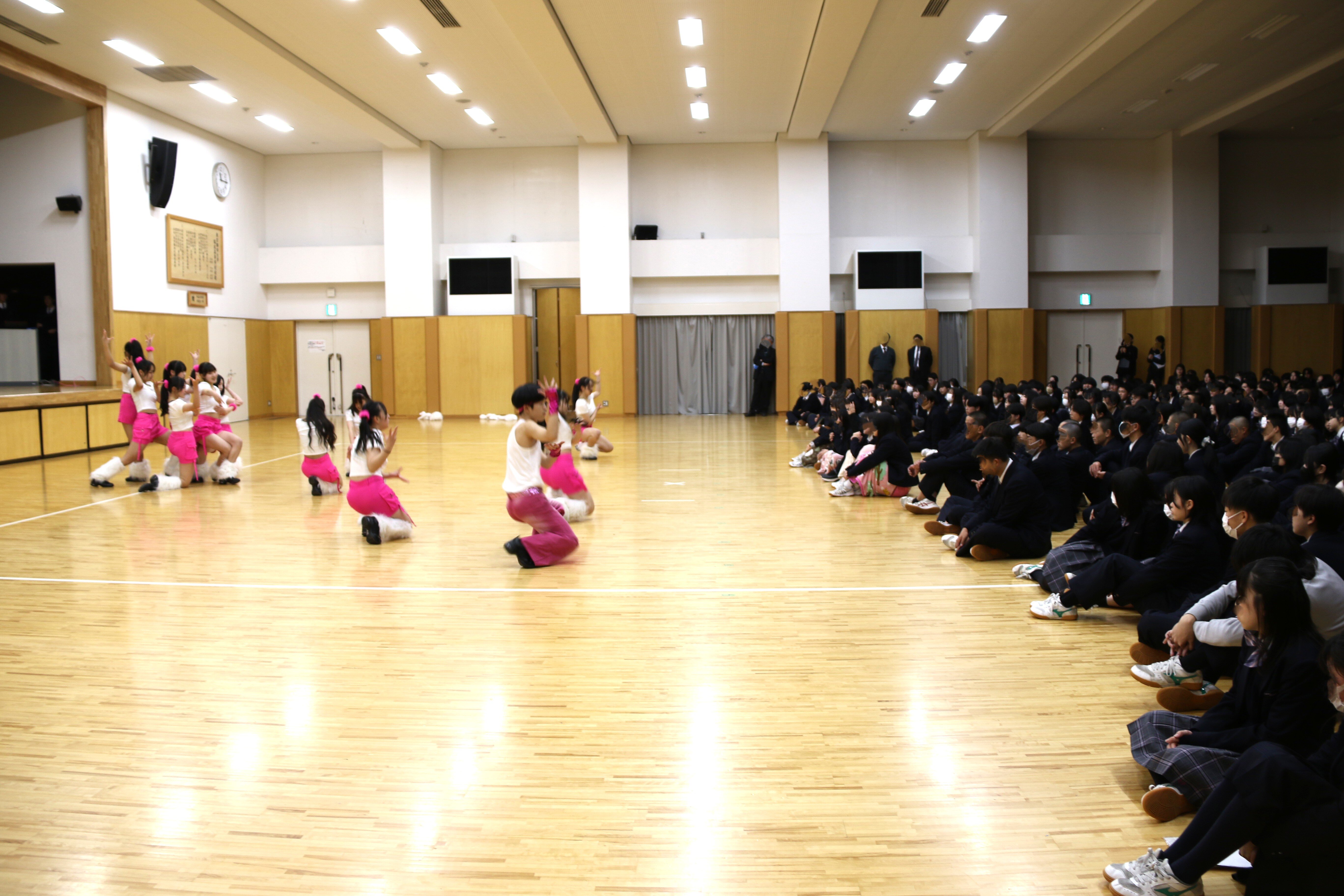 阪本校長からは、これまでも「『二兎を追う者は一兎をも得ず』の諺にとらわれず二兎でも三兎でも四兎でも追って、様々なことにチャレンジして欲しい」との言葉が生徒たちにかけられてきましたが、2025年もあらゆる場面で多くの生徒たちが輝かしい成績を残してくれました。その中でも、スピードスケートのジュニアワールドカップで輝かしい結果を残してくれた三井こころさん(2年生)と村山夏愛さん(2年生)、8年連続13回目の春高バレー出場を決めた女子バレーボール部には、五島育英会夢に翼を奨学金理事長特別表彰が送られました。また、各種大会で好成績を残したソフトテニス部とダンス部、個人ではスポーツクライミングで好成績を残した徳嵩悠乃さん(2年生)の顕彰も行われました。これを受けてダンス部が、受賞したときと同じパフォーマンスを披露してくれたり、海外研修に参加した生徒からの報告があったりと、例年とは異なる華やかな雰囲気に包まれ、スポーツ、文化、海外研修など、都市大塩尻の「らしさ」に満ち溢れた終業式となりました。