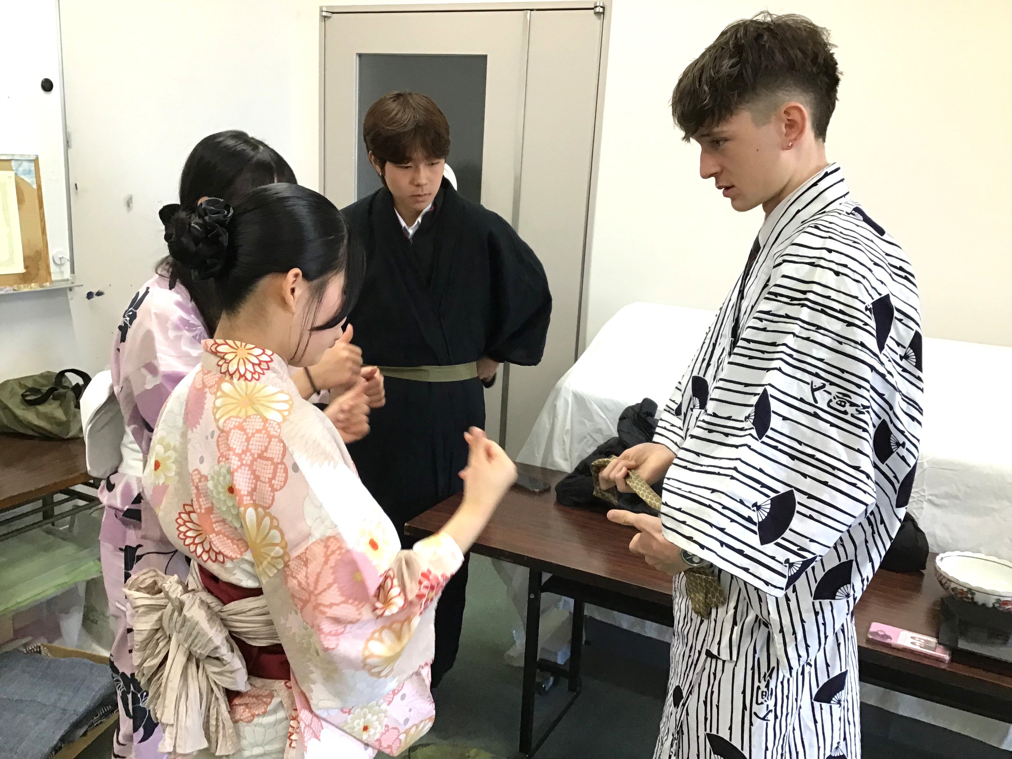 この日は、午前中に茶道体験と水引き作りに取り組みました。茶道部による茶道体験では、浴衣に着替えて本格的な作法を学び、日本の伝統文化を肌で感じることができました。