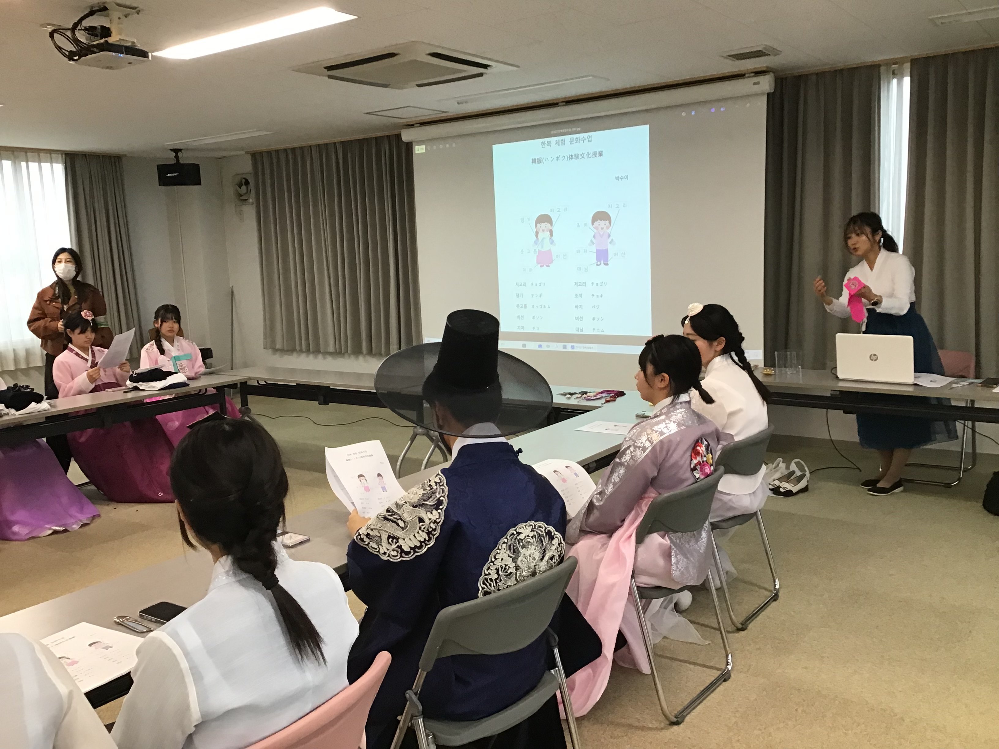 授業では、韓国の伝統衣装である韓服(ハンボク)について、その歴史や装飾品、衣装に込められた意味を学習しました。