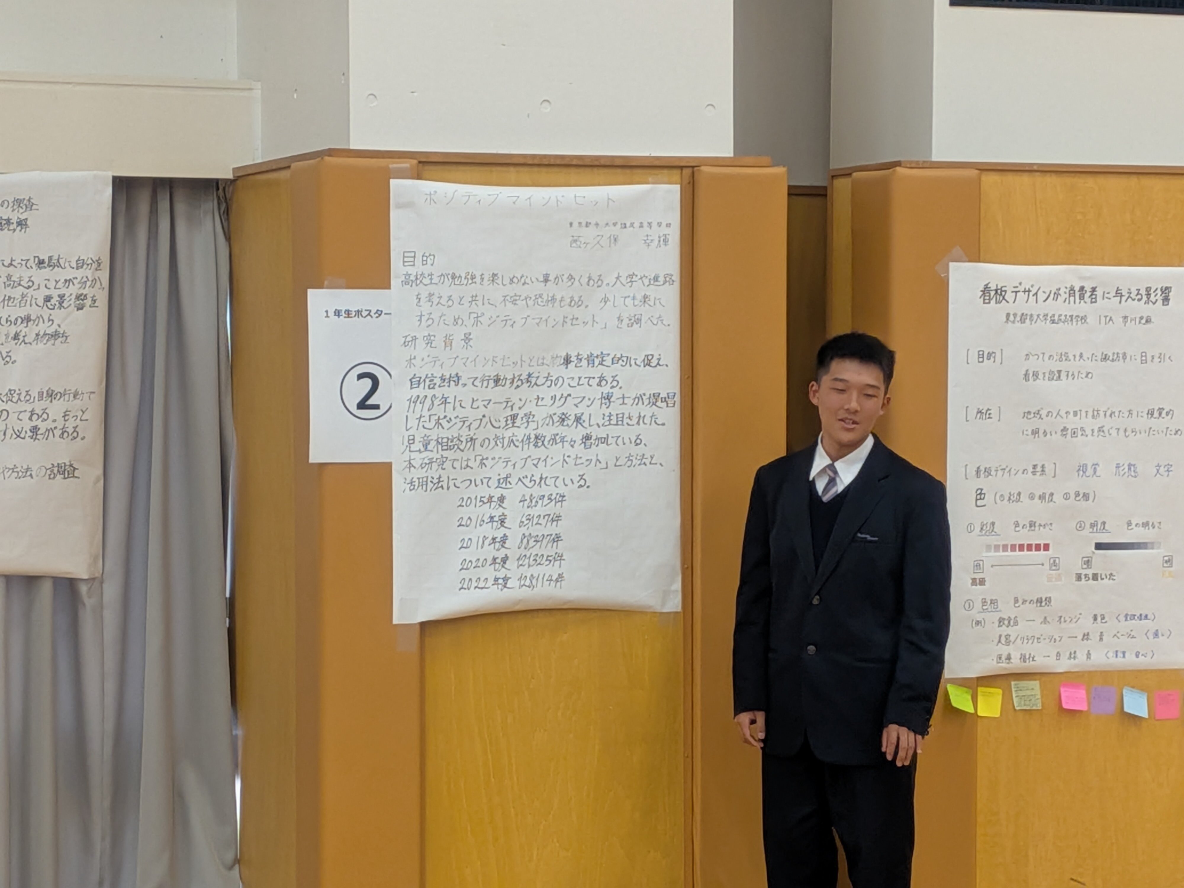 1年生は、社会課題や自身の進路と関連づけた自由テーマによる探究活動について、ポスター形式で発表を行いました。一方、2年生は、2年間にわたる探究活動の成果を、スライドを用いた口頭発表として発信しました。いずれの発表においても、生徒たちは堂々と成果を発表し、来場者との間で活発な質疑応答が行われました。