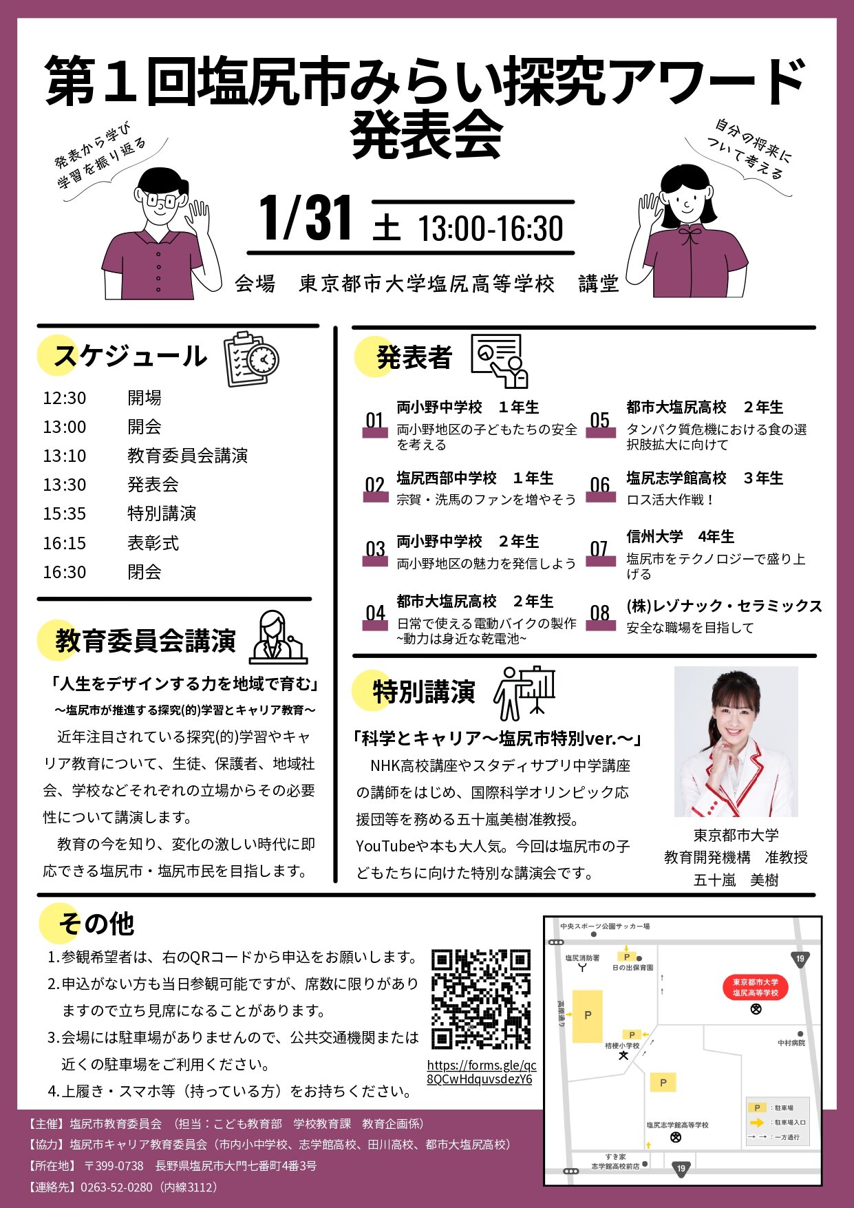 塩尻市教育委員会主催の「第1回塩尻市みらい探究アワード発表会」が1月31日(土)本校を会場に行われます。本校の生徒だけでなく、大学生、他校の生徒さん、地元の中学生の皆さんも発表します。また、東京都市大学教育開発機構准教授 五十嵐美樹先生による特別講演も予定されています。多くの皆様のご参加をお待ちしております。