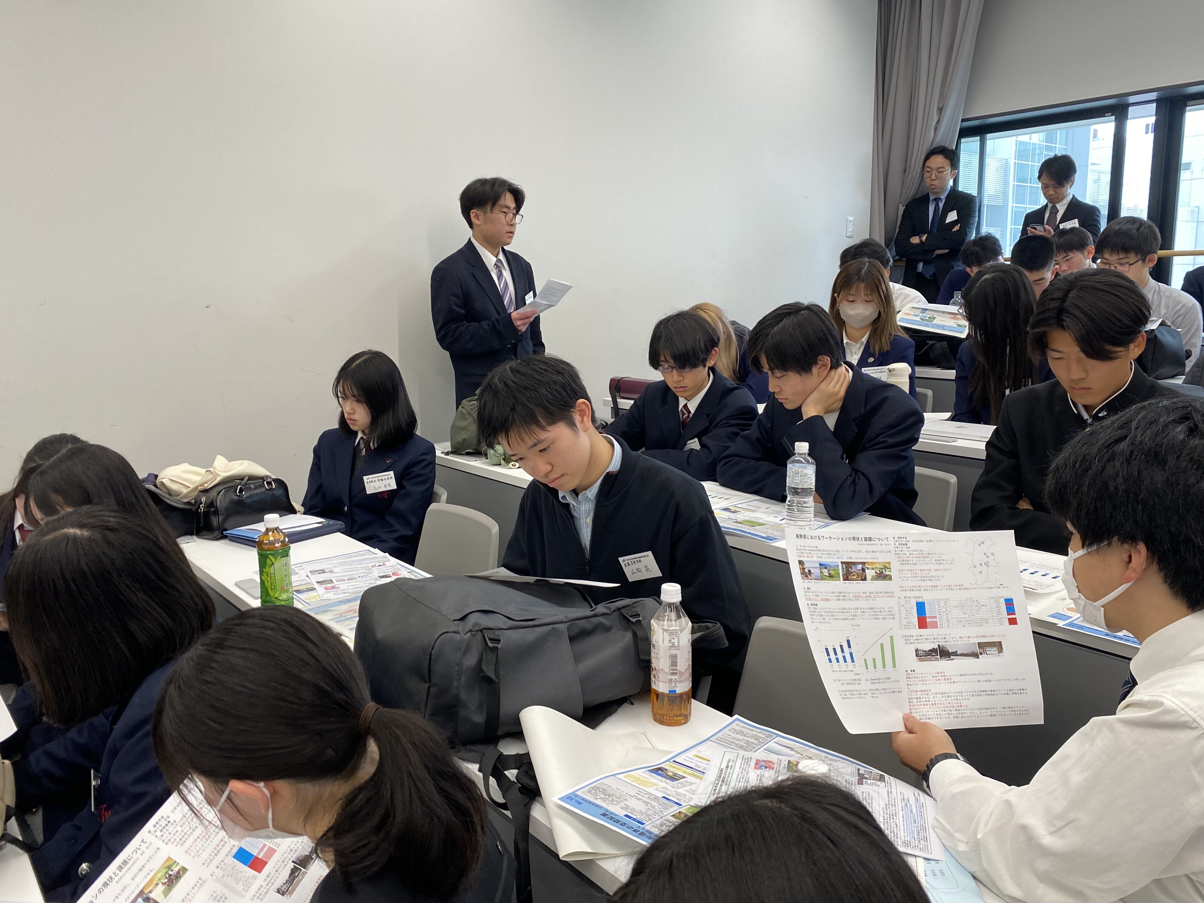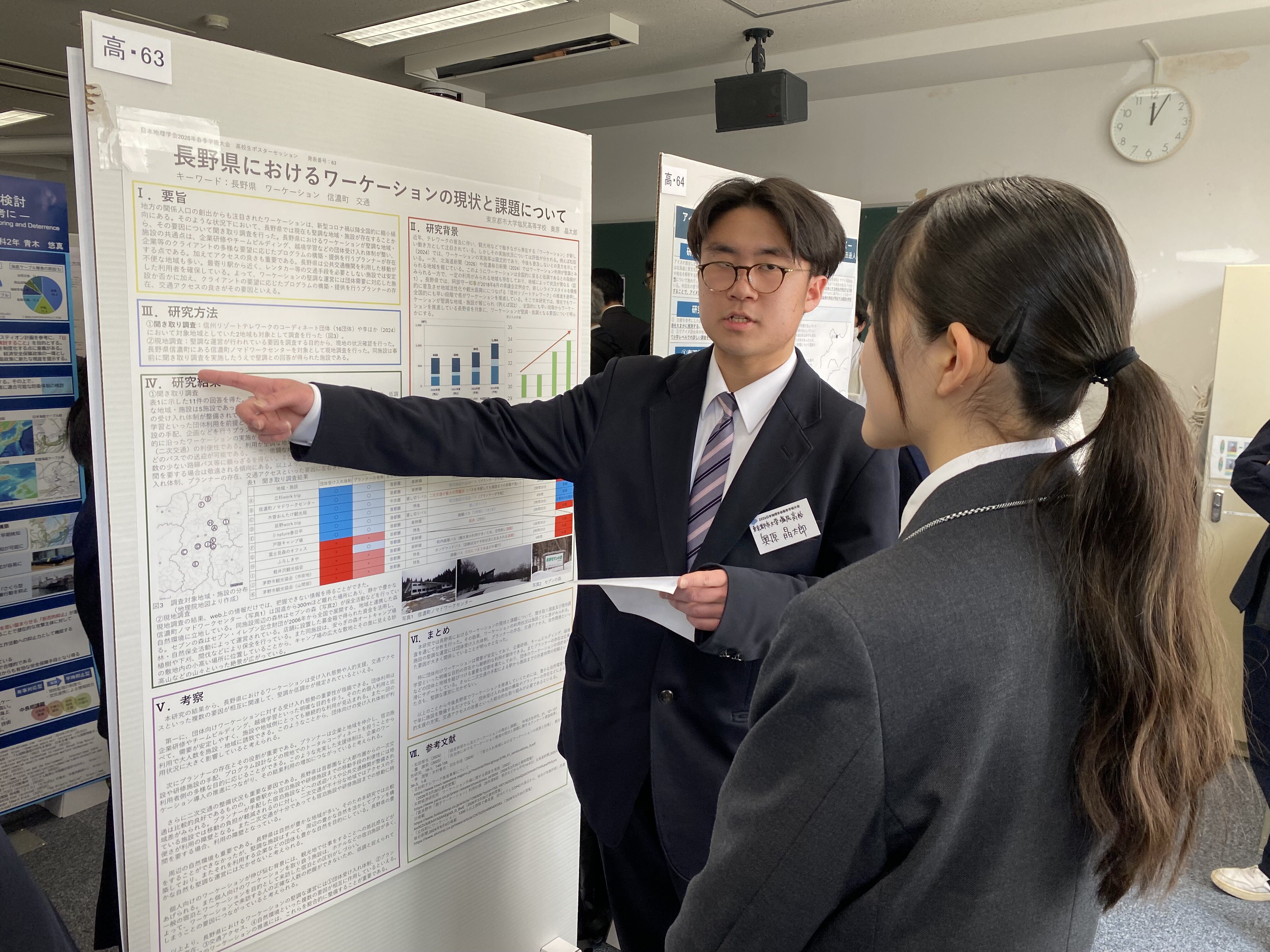 奥原くんの発表タイトルは「長野県におけるワーケーションの現状と課題について」です。これまでの取り組みを大会規定のA0サイズの用紙1枚にまとめ、発表しました。奥原くんは1年生の頃からワーケーションに関連した探究活動に取り組んできました。取り組みの発端は松本空港の利用推進でした。全国の空港の取り組みを調べる中で、和歌山県の南紀白浜空港では空港利用者増加の要因のひとつにワーケーションによる来訪者の増加がありました。この点に着目し、松本周辺地域において企業の方々とも連携したワーケーションの推進に取り組んできました。しかしながら、一定数の観光客が訪れる松本市周辺地域において、ワーケーションを進めていきたいと考えている施設は少なく、その取り組みの推進は難しいものがありました。